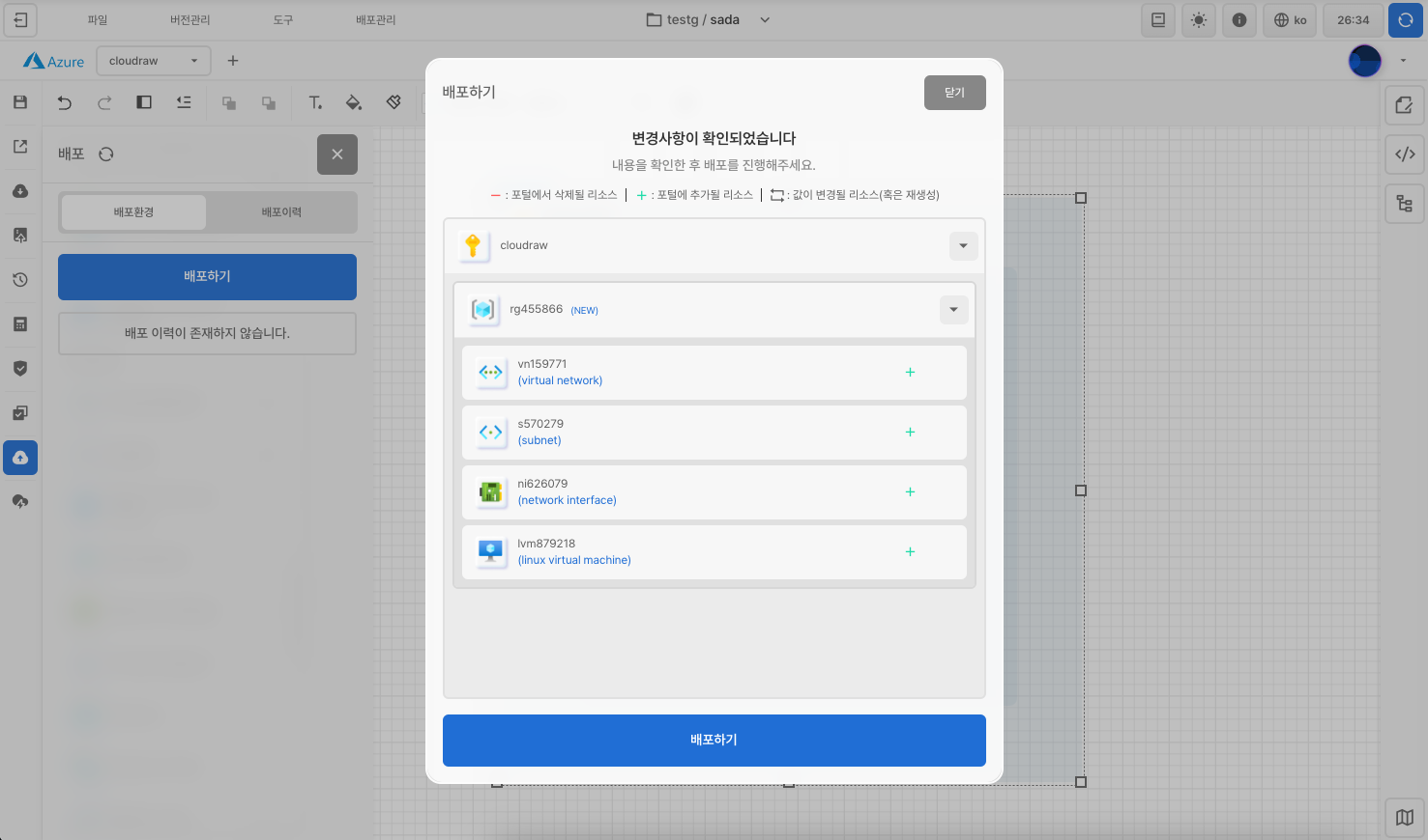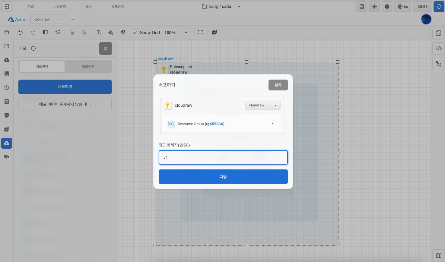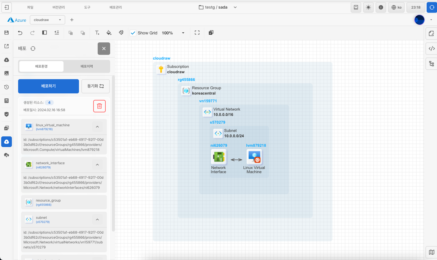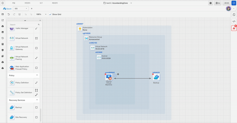캔버스에 그려진 인프라가 유효하면 해당 인프라를 IaC 코드로 자동 변환하여 제공합니다.