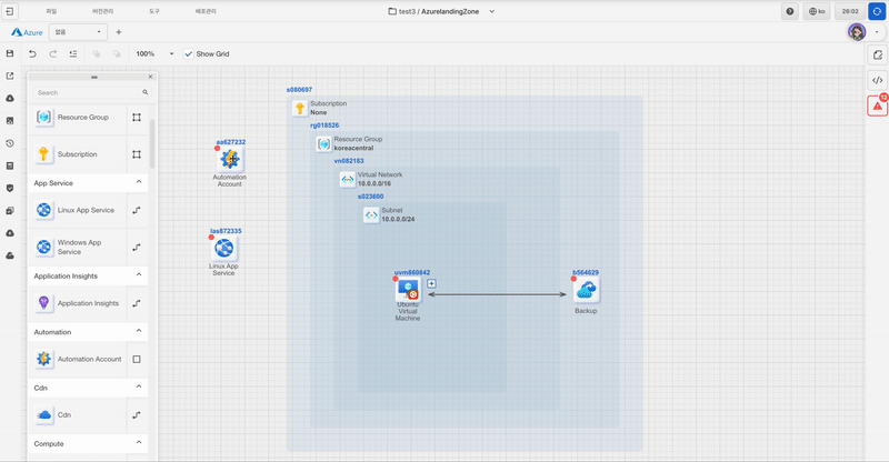 Drag & Drop은 캔버스를 구성할 수 있는 가장 단순한 기능입니다. 좌측 리소스 리스트에서 원하는 리소스를 끌어다 캔버스에 Drag & Drop으로 인프라를 그릴 수 있습니다.