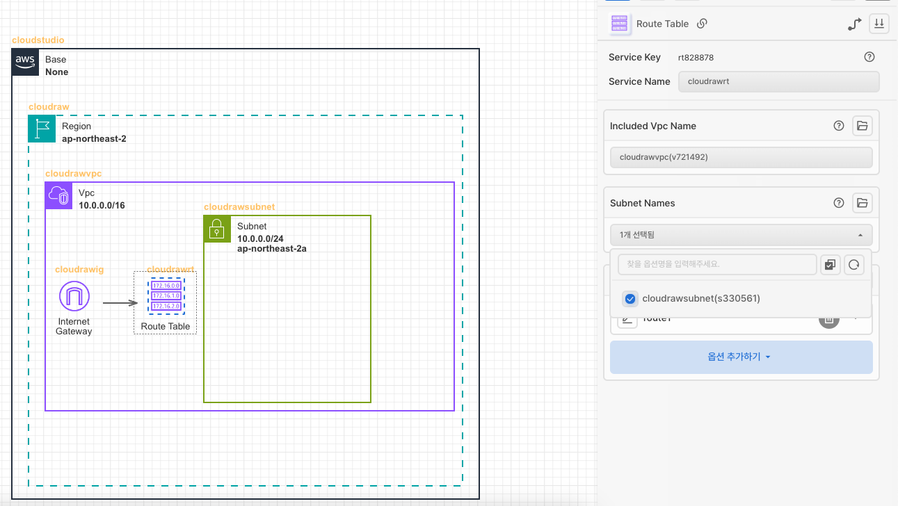 - Linked Route.Linked Resource Name: Internet gateway에서 Route table을 선으로 연결한 후 옵션에서 해당 Internet Gateway선택합니다.