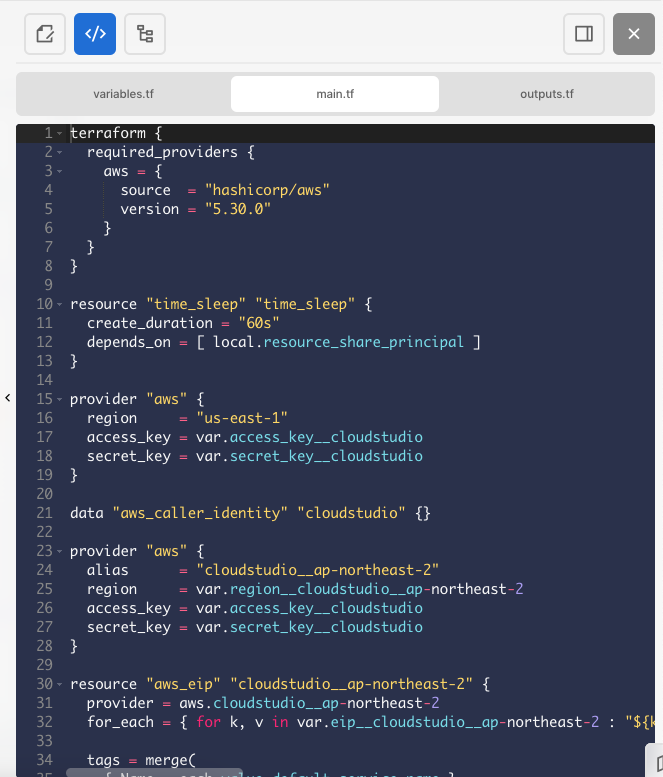 완성된 인프라는 IaC 코드로 자동변환되며 오른쪽 사이드바 코드 탭에서 제공됩니다.