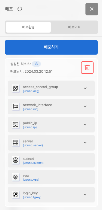 배포하기를 통해 연동된 크레덴셜을 타겟으로 실제 인프라를 배포할 수 있습니다.