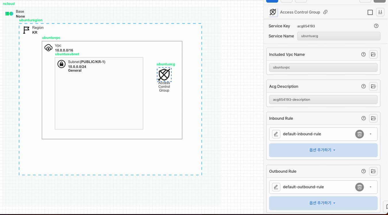 Access Control Group 아이콘을 가져온 후 VPC에 안에 배치시켜 줍니다. Inbound와 Outbound Rule설정으로 Network Interface의 접근통제를 제공하는 리소스입니다.