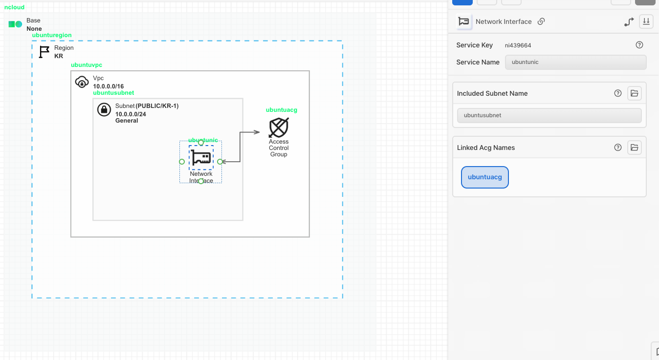 Network Interface 아이콘을 가져온 후 Subnet에 안에 배치시켜 줍니다. Server의 통신을 위해 사용하는 리소스입니다.