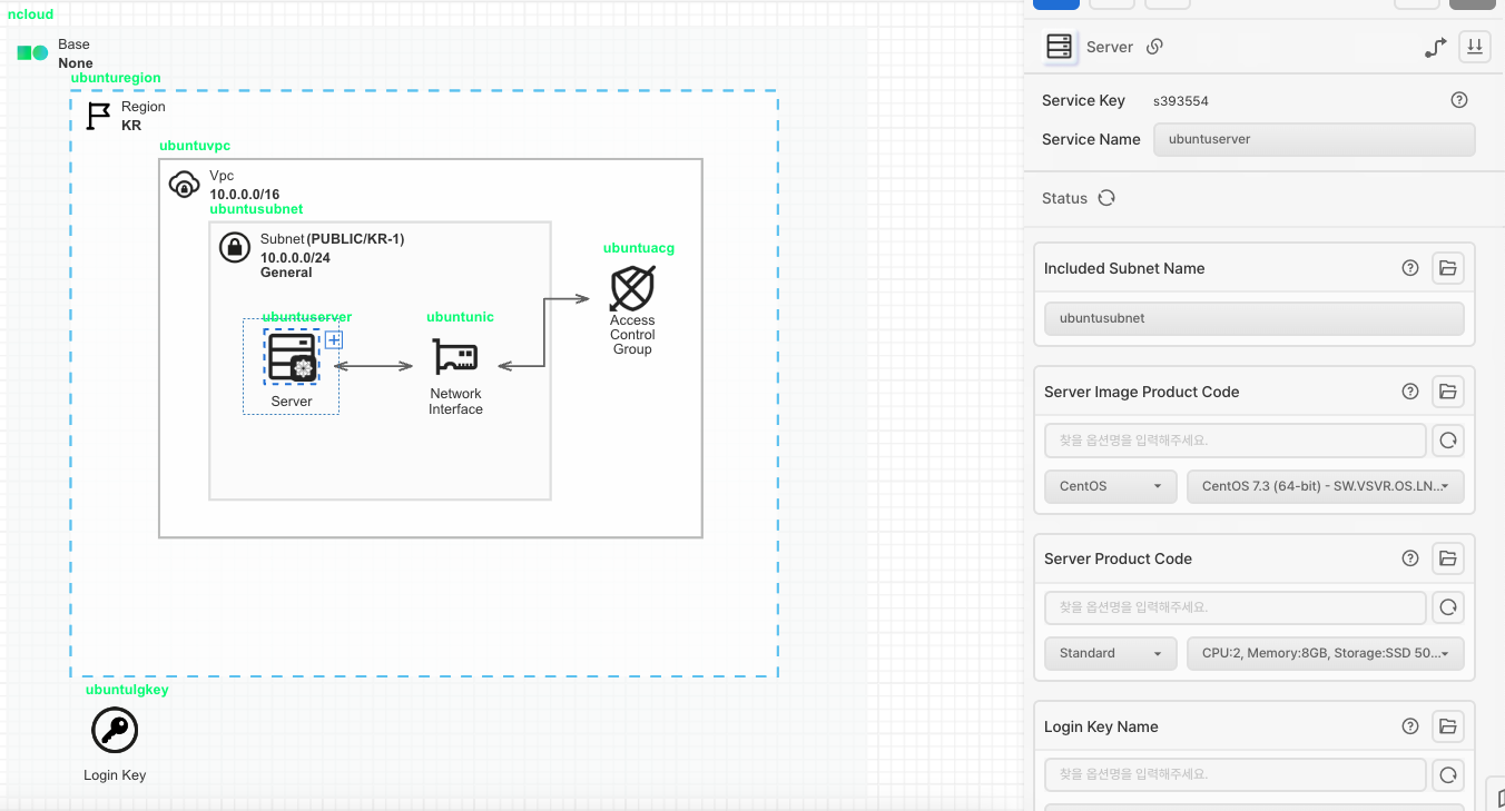 Server 아이콘을 가져온 후 Subnet에 안에 배치시켜 줍니다. Network Interface와 선으로 연결합니다. Login Key를 배치해둔 키를 선택하여 지정합니다.