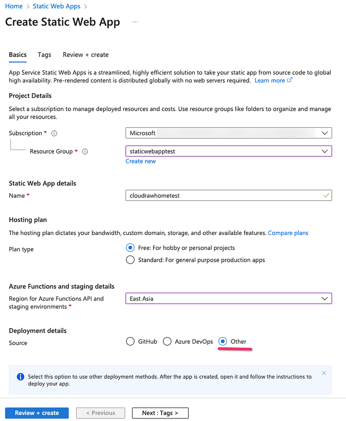- 사용할 구독과 리소스 그룹,Web static app 리소스의 이름을 설정합니다.