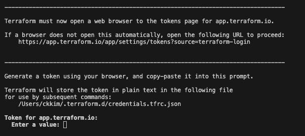 -해당 토큰은 ~/.terraform.d/credentials.tfrc.json에 저장됩니다.