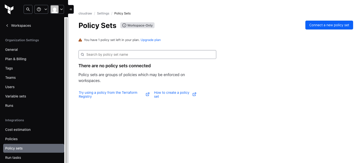 - 정책 생성 후 workspaces > Integrations > Policy sets 탭으로 이동합니다.