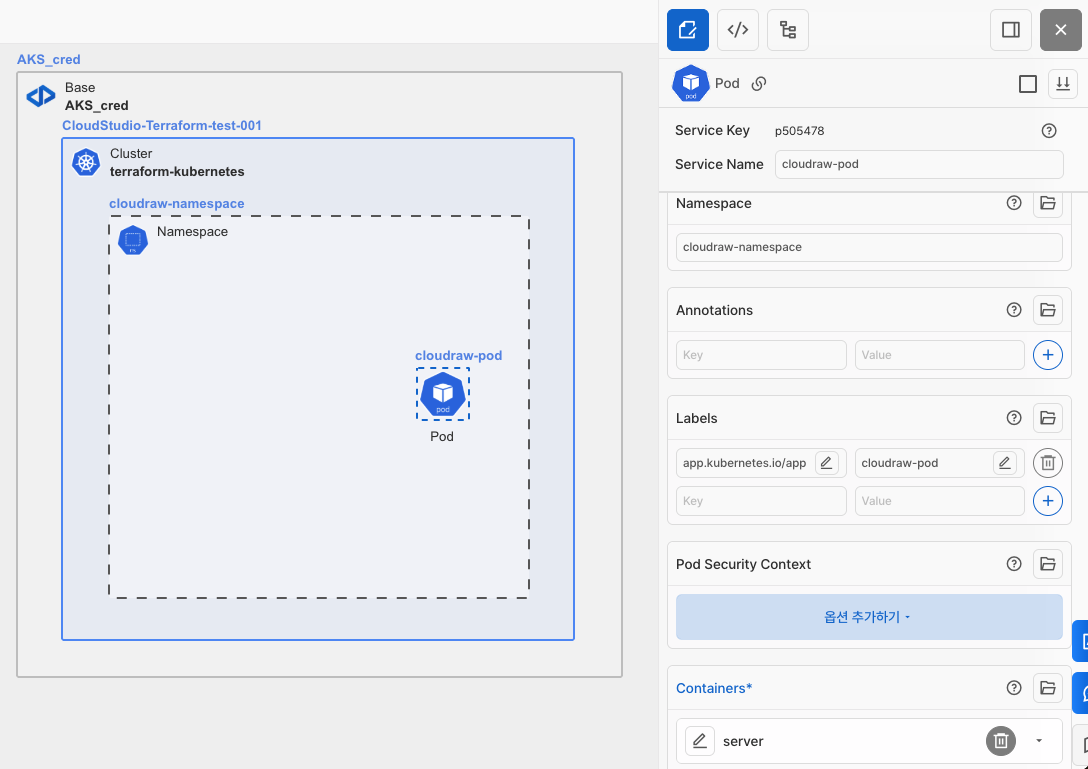 • Pod와 선으로 연결합니다. (Selector가 연결된 Pod의 값으로 설정됩니다.)