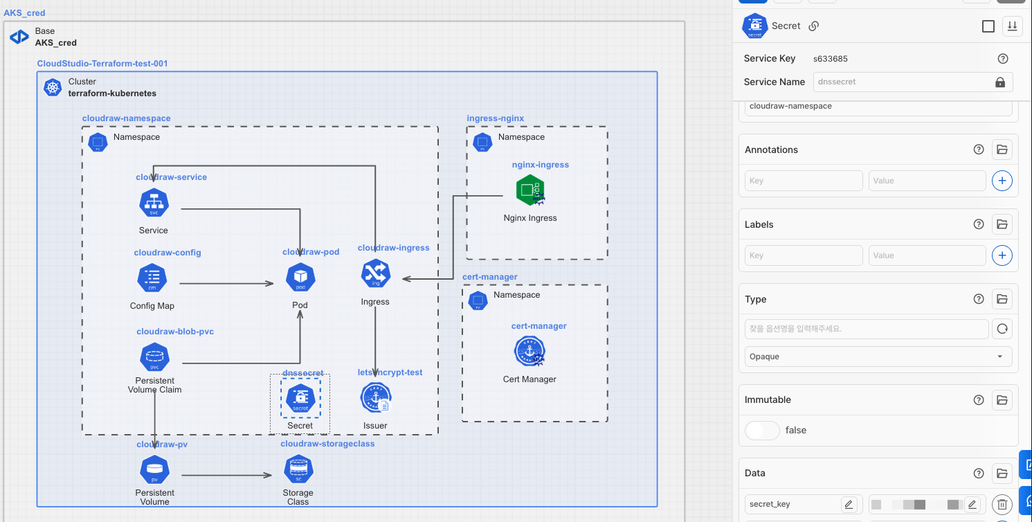 새 Namespace 아이콘을 가져와 Cluster안에 배치하고, Cert Manager 아이콘을 해당 Namespace에 배치합니다.