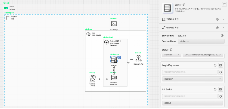Server 아이콘을 가져와 Subnet 안에 배치합니다. SourceDeploy의 대상이 되는 Ubuntu Server를 생성합니다. Network Interface와 선으로 연결하고, 각각 위에서 생성한 LoginKey와 InitScript를 옵션 값으로 설정합니다.
