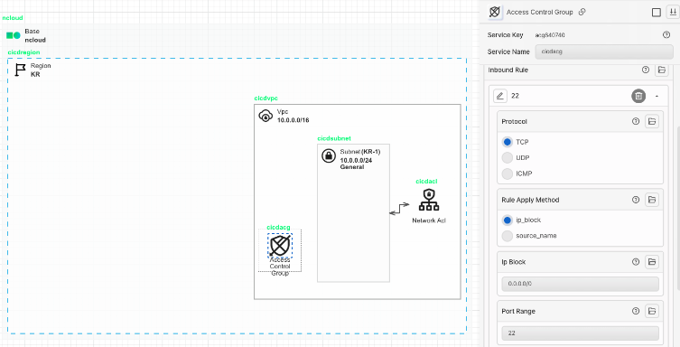 Access Control Group 아이콘을 가져와 VPC 안에 배치합니다. Access Control Group은 서버 간 네트워크 접근을 IP/Port 기반으로 필터링하는 방화벽 서비스입니다. Ubuntu Server로 ssh 접속과 Nginx를 통한 http 트래픽이 들어올 수 있도록 22번과 80 포트를 허용합니다.