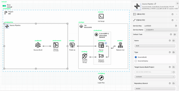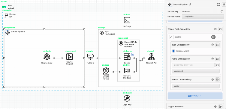Source Pipeline 아이콘을 가져와 Region 안에 배치합니다. Source Pipeline은 SourceCommit, SourceBuild, SourceDeploy 서비스를 통합하여 빠르고 안정적인 소프트웨어 출시를 위한 프로세스 자동화 서비스입니다. 우선은 Source Pipeline 리소스를 Region 위에 올려만 놓고, 옵션 값 설정은 SourceCommit, SourceBuild의 옵션 설정이 끝난 후에 진행합니다.