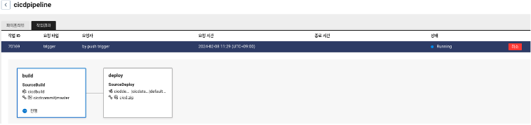 이후 SourceCommit에 업데이트된 코드를 푸시하면 빌드부터 배포작업까지 자동으로 진행되는 것을 확인할 수 있습니다.