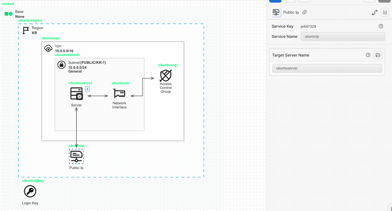 Server 아이콘을 가져온 후 Subnet에 안에 배치시켜 줍니다. Network Interface와 선으로 연결합니다. Login Key를 배치해둔 키를 선택하여 지정합니다.