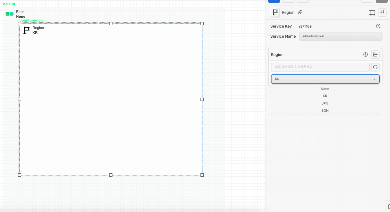 Region 아이콘을 가져 온 후 Base에 안에 배치합니다. Ncloud에서는 한국(KR), 일본(JPN), 싱가폴(SGN) 리전을 제공하고 있습니다.